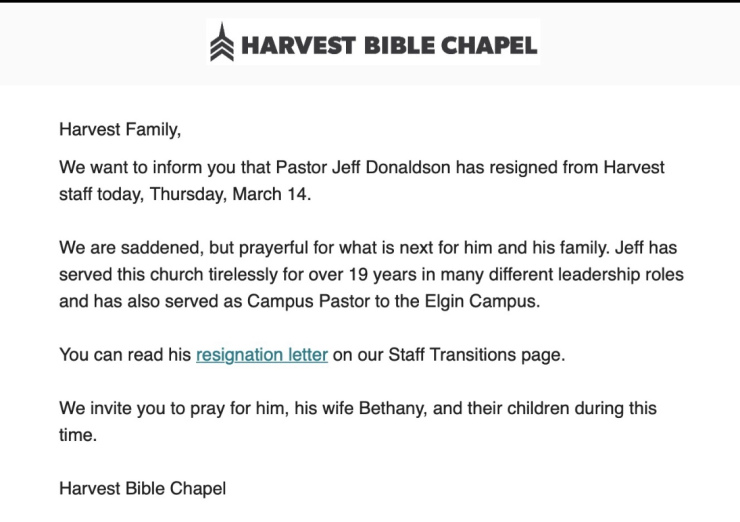 Let me say from the outset that we love this church. And because we love the church we have made the decision to immediately step away so that there are no obstacles to Harvest getting healthy again.